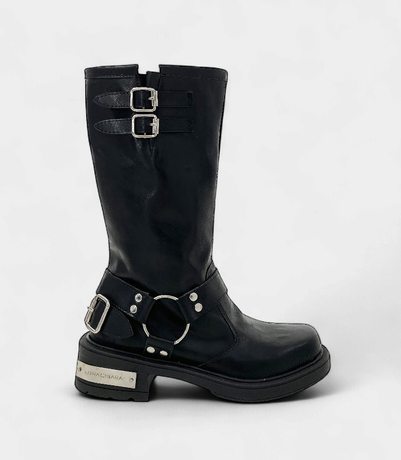 Biker de caña media confeccionada en PU con herrajes metálicos y doble hebilla lateral. Un diseño con actitud que se adapta a tu estilo día y noche.
