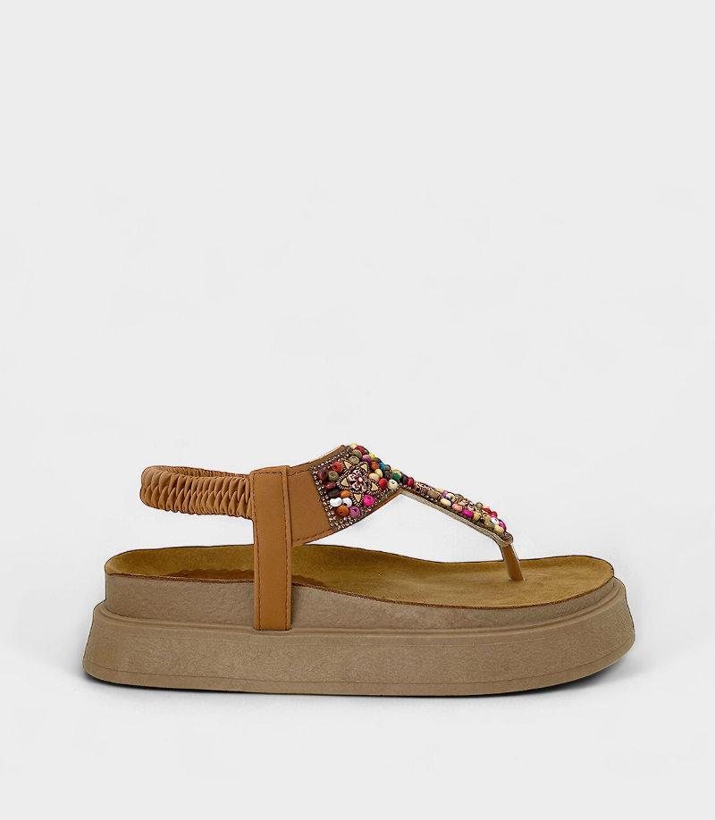 La sandalia Diana es la combinación perfecta de comodidad y estilo Boho Chic. Su diseño se complementa con tiras decoradas con cuentas y mostacillas multicolor.