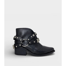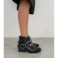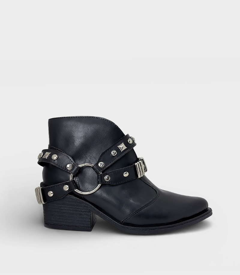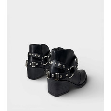 Detalle: Correas con tachas y argollas plateadas que destacan el diseño.
