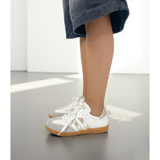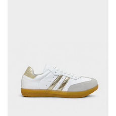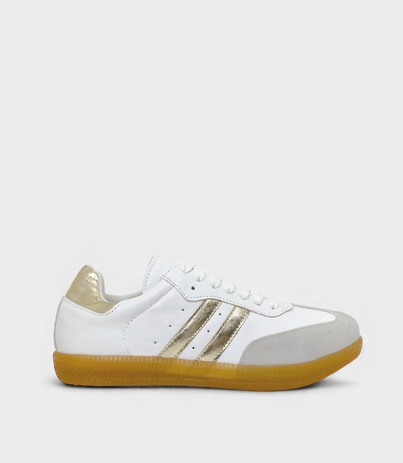 La Zapatilla Loker combina el blanco con llamativos detalles en oro metálico en las franjas laterales y el talón.