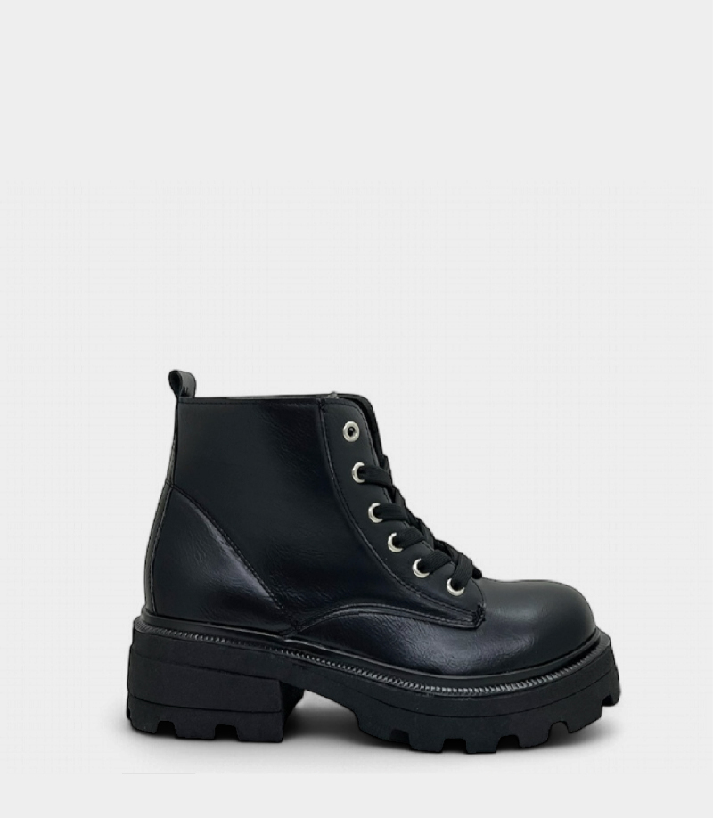 Pensado para un uso urbano con gran presencia. Confeccionado en material PU de alta calidad, su capellada se complementa con ojalillos metálicos que aseguran un ajuste firme y duradero. La suela track con base dentada ofrece altura y una pisada estable, garantizando un calce cómodo para todo el día.