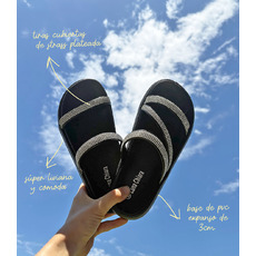 La Sandalia Tefu es tu opción ideal para el uso diario de verano. Este modelo tipo ojota te ofrece el confort de una plataforma liviana y la sofisticación de sus tiras brillantes.