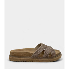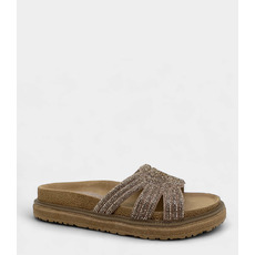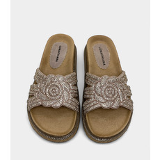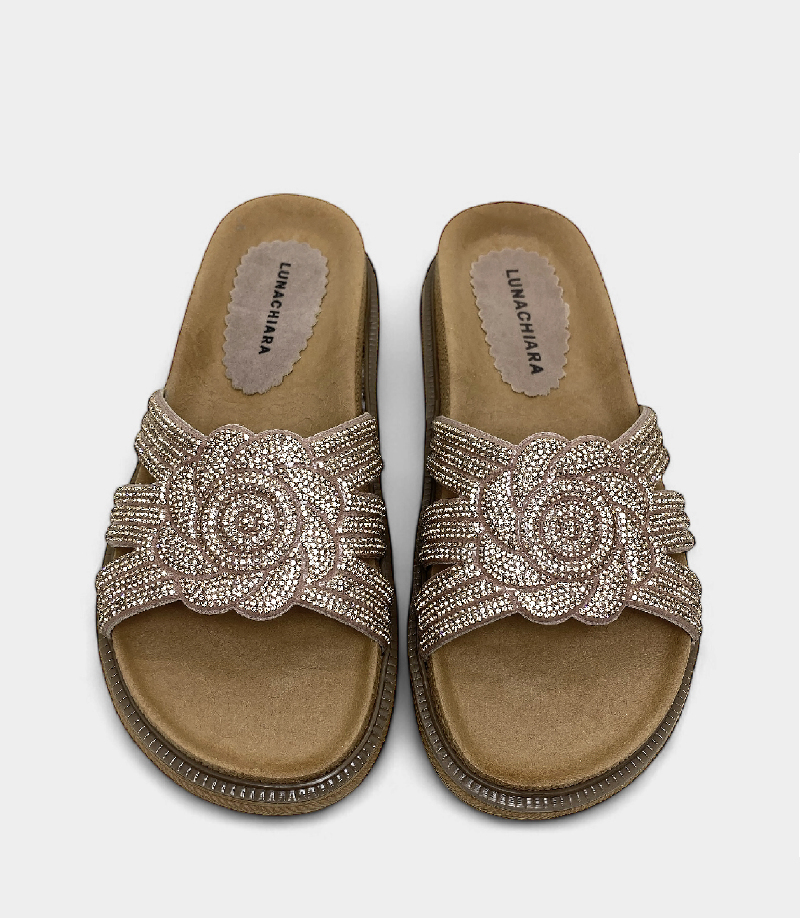 Sandalia baja con fajas cruzadas de strass que forman un diseño de flor central. Un modelo versátil que combina brillo decorativo con un calce relajado.