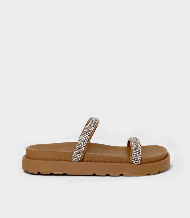 La Sandalia Tefu es tu opción ideal para el uso diario de verano. Este modelo tipo ojota te ofrece el confort de una plataforma liviana y la sofisticación de sus tiras brillantes.