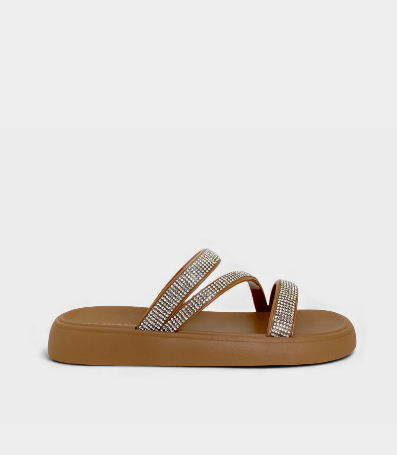 La Sandalia Zira es tu opción perfecta y liviana para el uso diario durante el verano. Este modelo tipo ojota combina la comodidad con un toque glamuroso, gracias a sus tiras de brillo.
